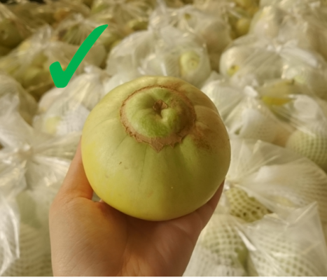 – Ngửi thử mùi thơm ở đáy dưa: dưa lê ngọt thì mới có mùi thơm khi chín, do vậy để chắc chắn quả dưa lê bạn mua là chín tự nhiên, chứ không phải do ép chín hoặc chín bằng thuốc, hãy ngửi thử đáy quả dưa lê để xem có mùi thơm hay không.